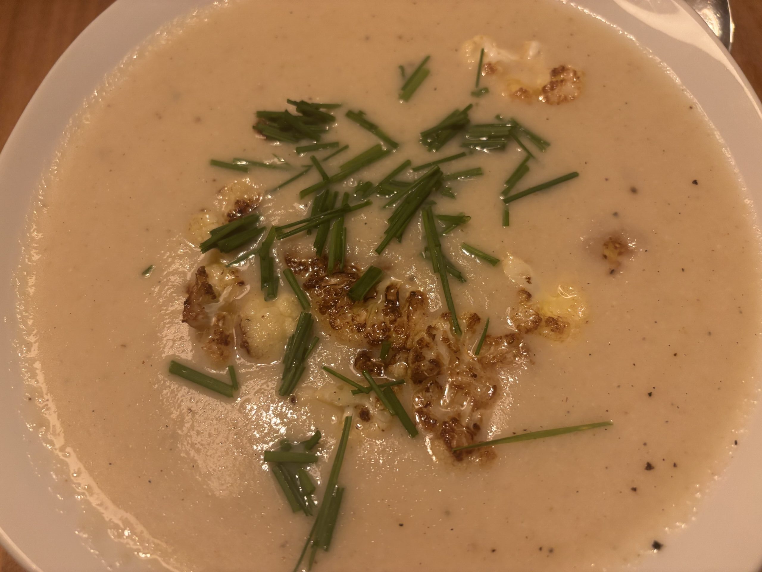Blumenkohlcremesuppe im Teller mit gerösteten Blumenkohlstücken und Schnittlauch