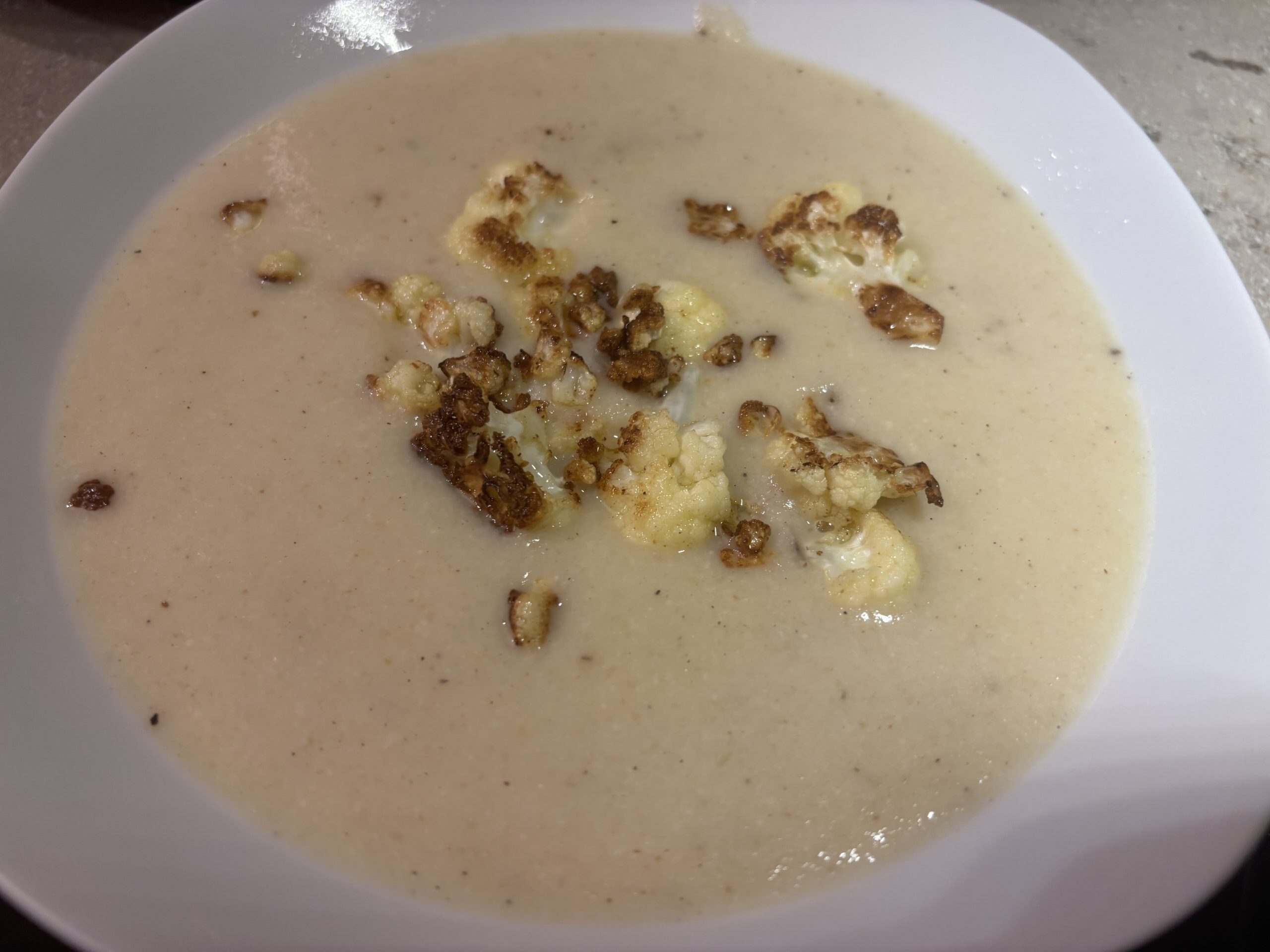 • Suppe im Teller mit gerösteten Blumenkohlröschen als Topping